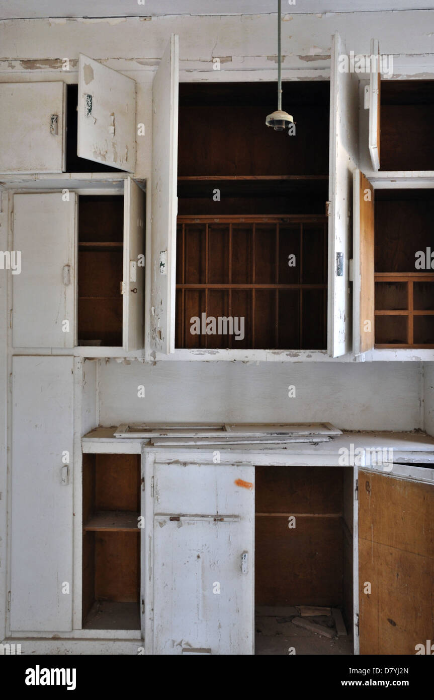 Old simple kitchen interior design with ugly messy cabinets in need of remodel.